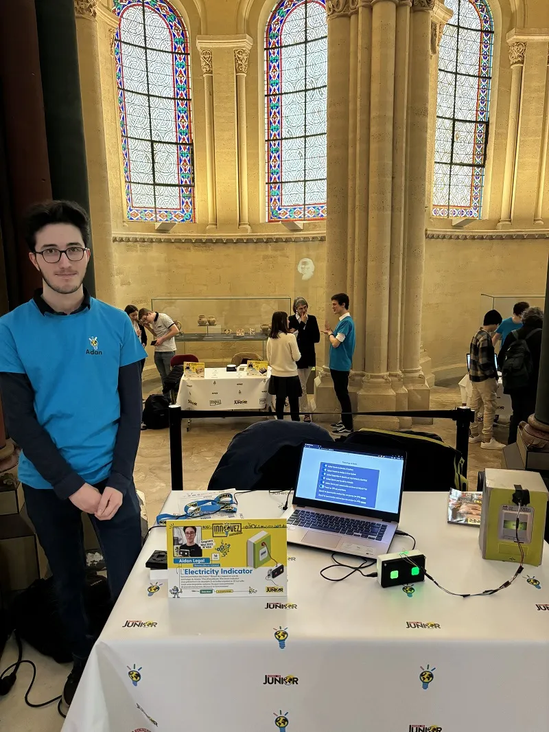 1er prix : Aidan Legal, 16 ans, inventeur du « Electricity Indicator », un petit boîtier imprimé en 3D qui surveille la consommation carbone et prévient en cas de surconsommation électrique ou de surcharge du réseau.