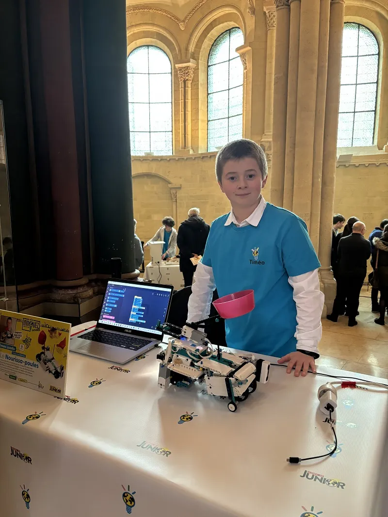 2e prix : Timéo Listello, 12 ans, inventeur du « Nourissa Poules » un robot en légo qui permet de récupérer et de transporter les aliments jusqu’au poulailler pour nourrir ses poules.
