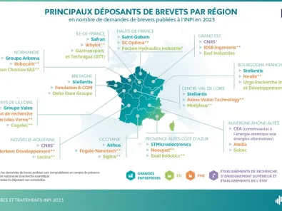 Le palmarès régional 2023 des principaux déposants de brevets à l’INPI dévoile les acteurs économiques (grandes entreprises, ETI, PME, établissements de recherche, d’enseignement supérieur et établissements de l’État) qui contribuent à l’innovation des régions françaises.