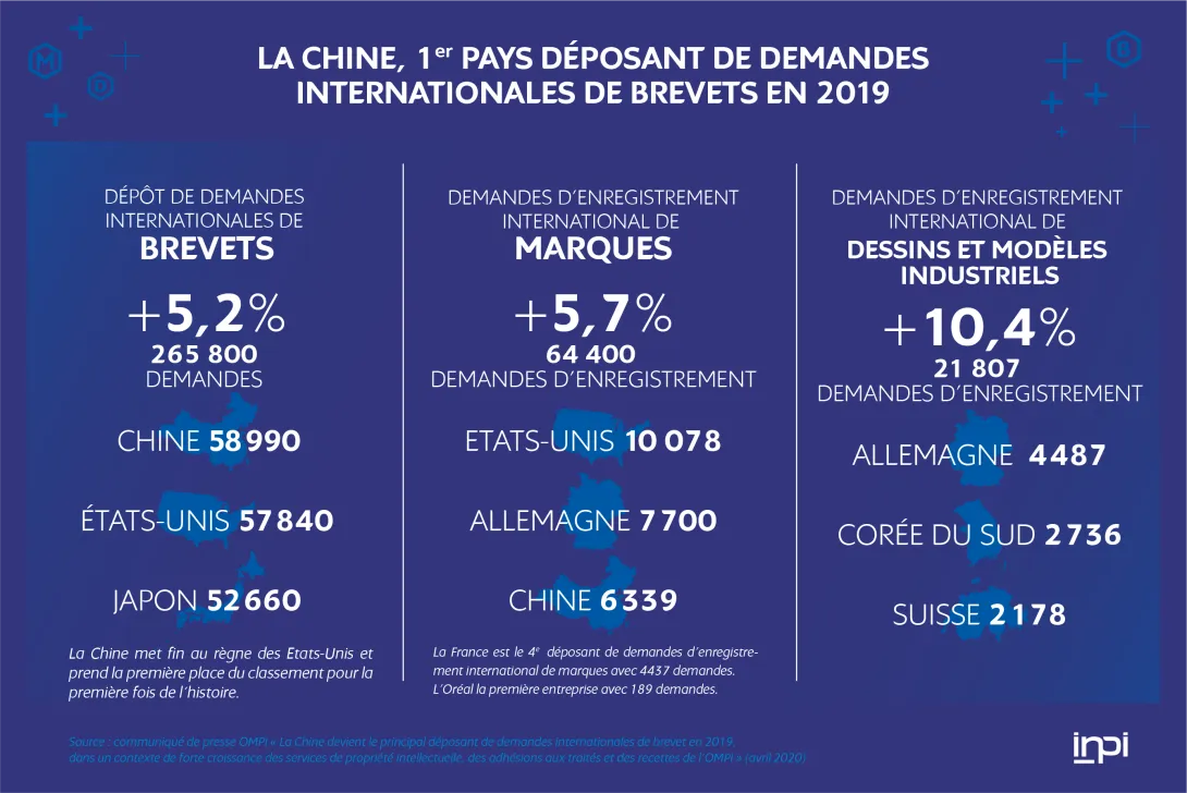 Source : communiqué de presse de l'Organisation mondiale de la propriété intellectuelle (OMPI) « La Chine devient le principal déposant de demandes internationales de brevet en 2019 dans un contexte de forte croissance des services de propriété intellectuelle, des adhésions aux traités et des recettes de l'OMPI » (avril 2020).
