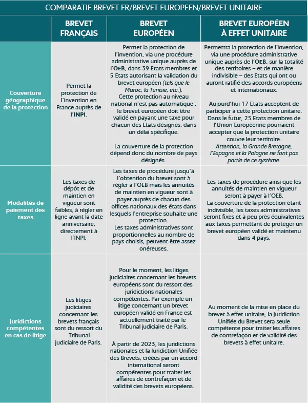 Tableau comparatif brevet français/brevet européen/brevet unitaire