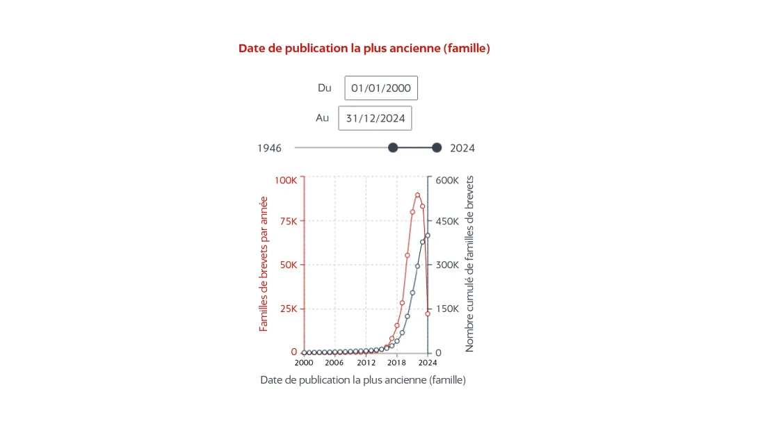 Ce phénomène est également remarquable au niveau national. Ainsi, le graphique ci-dessous illustre la croissance spectaculaire du nombre d’inventions dans le domaine de l’IA ayant fait l’objet d’une démarche de protection par un dépôt de brevet auprès de l’INPI.