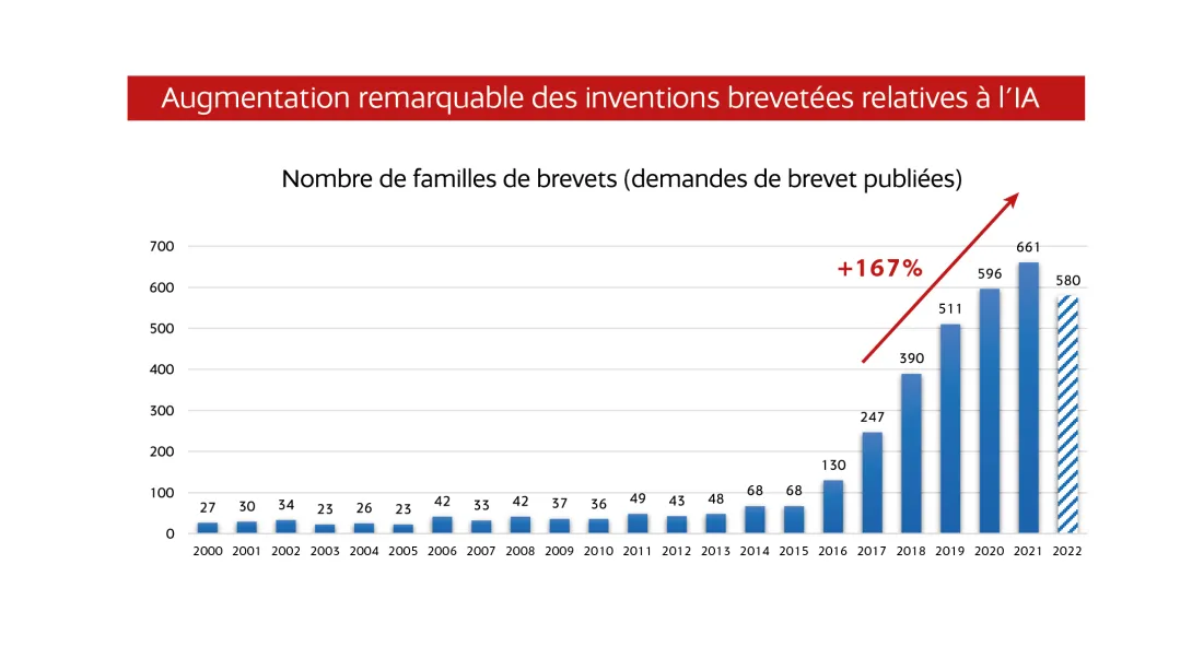 Au niveau de l’Office européen des brevets (OEB) par exemple, le nombre d’inventions relatives à l’IA ou embarquant une intelligence artificielle a été multiplié par 17 entre 2016 et 2022.