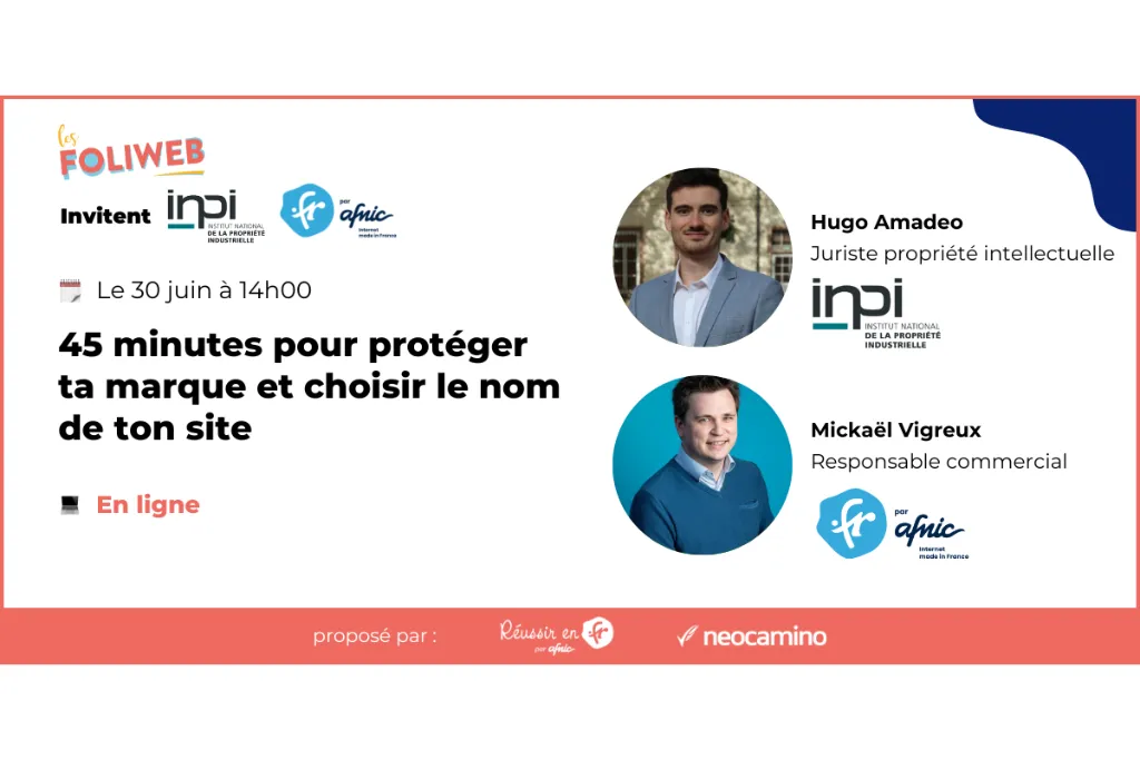 Le webinaire sera co-animé par Hugo Amadeo, juriste propriété intellectuelle à l'INPI, et Mickaël Vigreux, Coach Réussir en .fr à l'Afnic.
