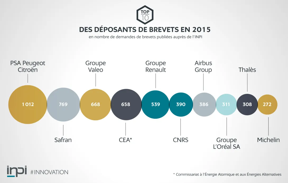 PSA Peugeot Citroën conserve sa première place avec 1 012 demandes de brevets publiées (1 063 demandes en 2014). Safran maintient sa place au deuxième rang, passant de 717 demandes publiées en 2014 à 769 demandes publiées cette année.