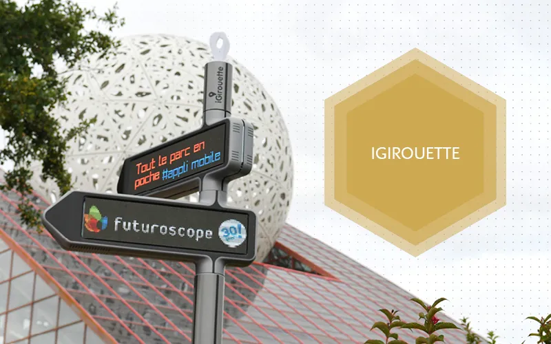 Christophe Quatrini : Charvet Digital Media est une PME experte dans la communication digitale extérieure. Nous concevons et fabriquons depuis quarante ans les écrans digitaux que vous trouvez dans les villes, la grande distribution ou encore les écrans géants dans les stades. iGirouette est un tout nouveau concept de signalétique connectée, fruit de quatre ans de R&D. C’est un dispositif dynamique et en mouvement qui informe les citoyens ou visiteurs en temps réel. Prenons l’exemple d’une ville : les deux flèches d’iGirouette, qui tournent en fonction de l’information donnée, indiqueront en temps réel aux passants les informations et événements du jour ou de la semaine — telle inauguration à 10h à 400 mètres, telle exposition aujourd’hui à tel endroit à dix minutes à pied. Le temps de déplacement est indiqué selon le mode doux retenu (à pied, à vélo, en transports en commun). Le dispositif a été lancé en été 2017 et est déjà en place dans certaines villes (Lyon, Calais), gares SNCF et au Futuroscope de Poitiers. Là, il permet par exemple d’indiquer aux visiteurs les spectacles et attractions en cours où il y a le moins de temps d’attente.