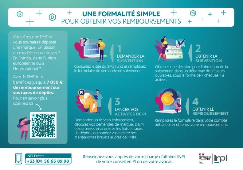 Le fonds de subvention SME Fund mis en œuvre par la Commission européenne et l’Office de l'Union européenne pour la propriété intellectuelle (EUIPO) à destination des petites et moyennes entreprises (PME) européennes, évolue pour l’année 2025. Il vous permet de bénéficier d’un remboursement partiel des taxes de dépôt de titres de propriété intellectuelle et des prestations de recherches d'antériorités de brevets effectuées par l'INPI, ainsi que des frais juridiques de rédaction pour un dépôt de brevet auprès de l'Office européen des brevets (OEB).