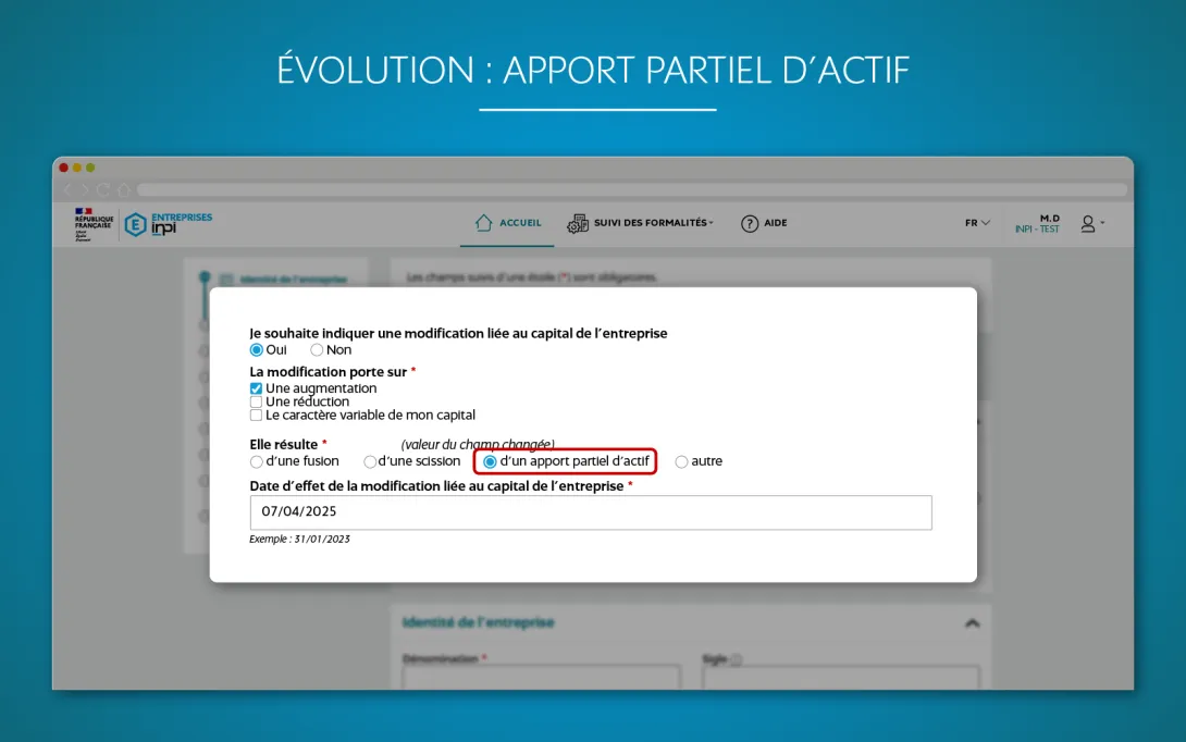 - Possibilité de réaliser une formalités de modification pour un apport partiel d'actif ;