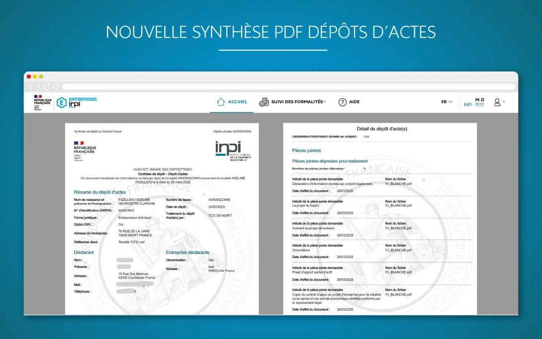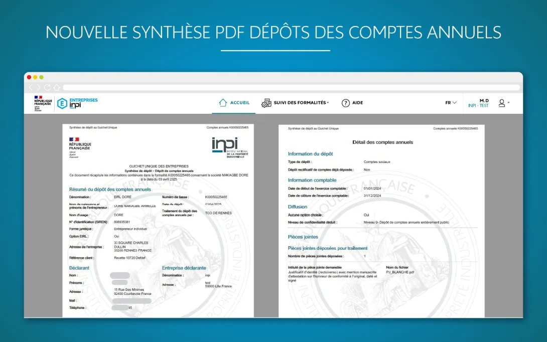 - Nouvelle mise en forme des fichiers de synthèse PDF relatifs au dépôt des comptes annuels et au dépôt d’actes ;