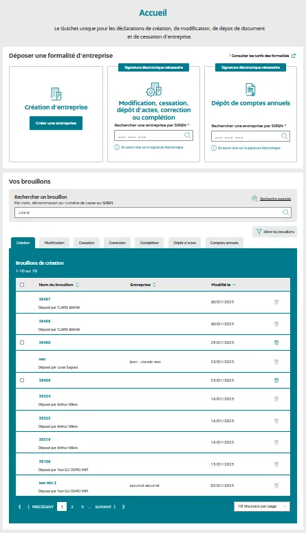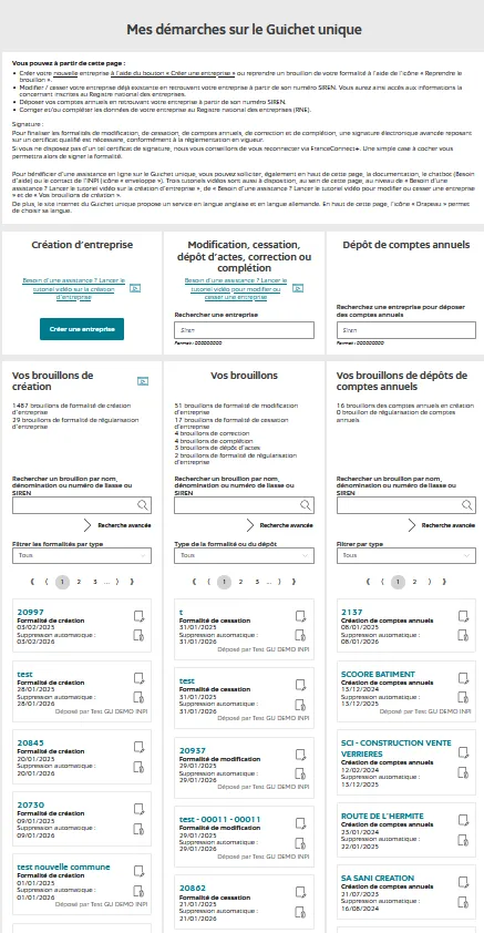 Une nouvelle page d'accueil plus ergonomique a été développée. Elle permettra un accès direct aux différentes formalités et une meilleure organisation pour la gestion des brouillons.
