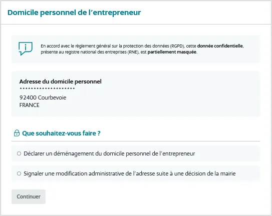 Lors de la saisie d’une formalité, les données confidentielles déjà présentes au RNE mais non diffusées (date et lieu de naissance, adresse personnelle) ne seront plus affichées et ne seront plus demandées systématiquement conformément aux exigences réglementaires (CNIL).