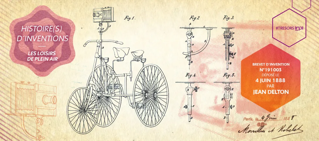 Le 19e siècle voit également la naissance et l’essor de la photographie. Très vite, les photographes amateurs désirent immortaliser les scènes et paysages qu’ils rencontrent lors de leurs randonnées. Dès lors, le matériel et les appareils se font plus compacts et plus robustes afin d’être transportés. Avec l’invention de la bicyclette, les randonnées pédestres deviennent cyclistes. En 1888, Jean Delton dépose un brevet d’invention pour « un nouveau support d’appareil photographique permettant d’adapter les chambres aux tricycles ou aux bicycles » (3). La nouvelle invention « permet aux touristes, amateurs de photographie, d’utiliser les vélocipèdes en général, comme pied servant à les soutenir en place ». Ce système doit être installé « de façon à ce qu’on puisse le déplacer verticalement pour pouvoir monter ou descendre la chambre qui de cette manière pourra être exhaussée ou abaissée, inclinée en avant ou en arrière, tourner complètement sur elle-même, de façon à répondre à tous les besoins du photographe qui pourra par la suite diriger avec facilité son objectif sur tous les points de l’horizon ».